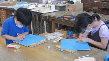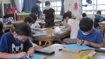 「木版画」の学習をしています。彫刻刀の持ち方や力の入れ具合を工夫して、線彫りをしました。どのように彫ると線通りに彫ることができるか、考えながら取り組んでいました。