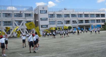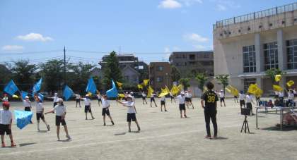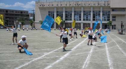 校庭で隊形移動がスムーズにできるように、練習しました。一人一人のフラッグには、お気に入りの漢字一文字が書かれています。