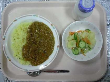 2日のメニューは、イエローライス、キーマカレー、ポテト入りフレンチサラダ、牛乳でした。