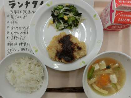 今日の給食は、麦ごはん、牛乳、味噌かつ、もやしの甘酢和え、吉野汁です。