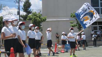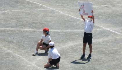 【運動発表会 係】6年生は、応援をしたり、レース順を知らせたりして、運動発表会の運営を支えました。団体競技の審判と短距離走の着順判定は、教職員が行いました。
