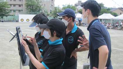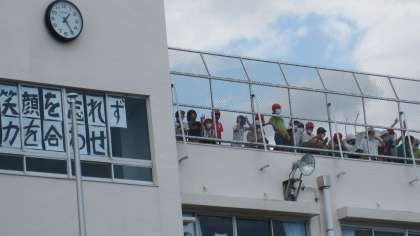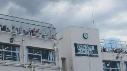 【6年生 100m走】下級生が屋上から精一杯応援しています。接戦が多く、着順はVTRで確認しました。