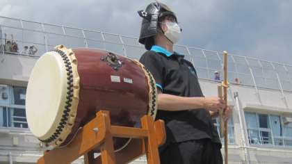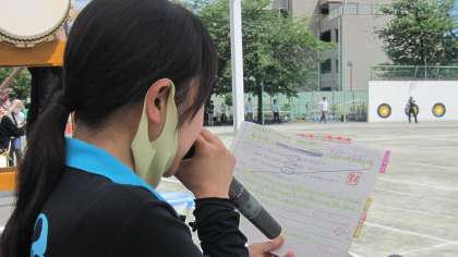【6年生 玉堤春の陣 2022】6年生最後の運動発表会を盛り上げようと、教員も全力を尽くします。全体指揮、アナウンスを担当します。
