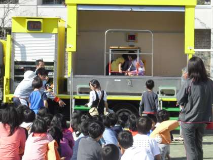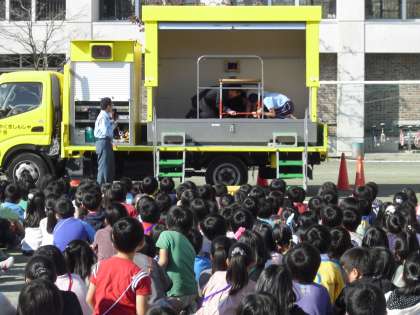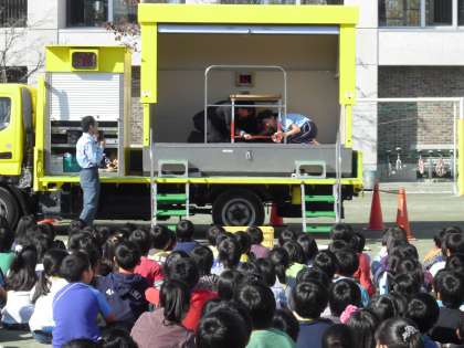 今日の避難訓練は「地震」です。大きなゆれを体験しました。区の防災課より、「起地車」をお願いし、説明と4年生、そして、新任の先生が体験しました。