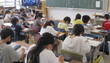 教材文『一つの花』の物語を読み、時代設定について考えたり、初発の感想をノートに書いたりしました。意見交換の際には、友達に自分の考えを熱心に伝えていました。