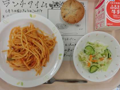 今日の給食は、スパゲティナポリタン、牛乳、イタリアンドレッシングサラダ、ブルーベリーマフィンです。