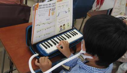 マスクをしながら工夫して鍵盤ハーモニカの演奏をしました。『かっこう』の曲をかっこうと歌う感じで滑らかに吹いていました。担任から丸をもらうとうれしそうにしていました。