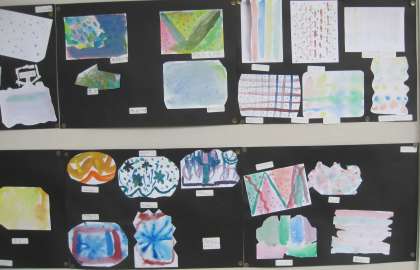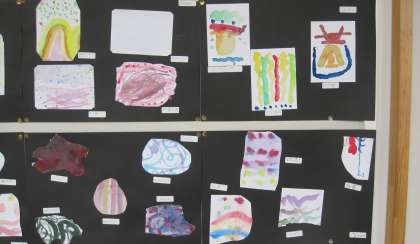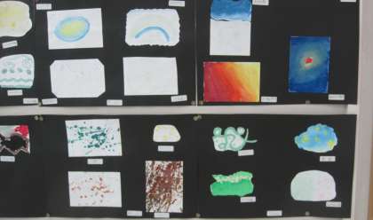 『えのぐLABO』絵の具でどんなことができるかな?と考えながら絵の具の研究をしました。「混ぜたらこんな色ができた!」「きれいににじんだよ!」とたくさんの発言がありました。作品ができたところで、色合いや形からイメージを広げ、題名をつけました。教室の廊下に掲示しています。