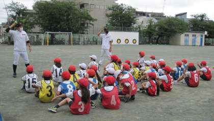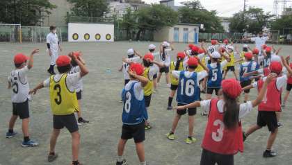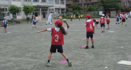 「ジャイアンツアカデミー」のコーチ2人をお招きしての授業です。ボールの投げ方を中心に教えていただきました。ボールを遠くに投げるために「トントンくるっ!」を合言葉にして練習しました。ボールを持った手の甲を頭に2回トン、トン、体をくるっと大きく回転させてボールを投げます。「できた!」「遠くに飛んだ!」とたくさんの声が上がりました。