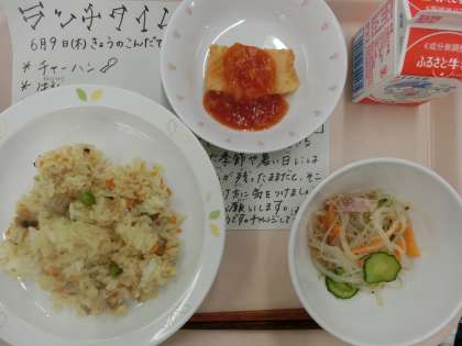 今日の給食は、チャーハン、牛乳、いかのチリソース、春雨サラダです。