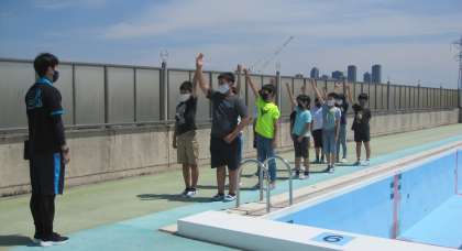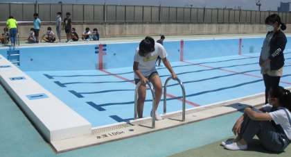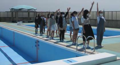 水泳の授業が始まる前に、運動委員がプールでのきまりや人数確認の仕方、入水の仕方など、映像で紹介するために、撮影をしました。