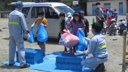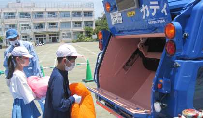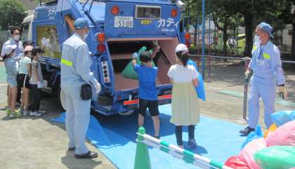 環境学習「ごみの処理と再利用」について学習を進めています。玉川清掃事務所の方から説明を聞き、「ごみ収集車」にごみを載せていく体験をしました。ごみを収集するときの服装を見たり、ごみの重さを体験したりする場面もありました。