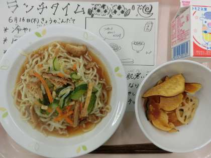 今日の給食は、冷やし中華、牛乳、野菜とお豆のチップです。
