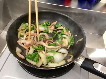 玉ねぎ、ピーマンを切り、ハムと一緒に炒めました。焦げないように気をつけながら調理することができました。
