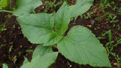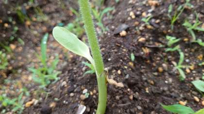 教材園で育てているヒマワリの子葉がしおれて本葉が育ってきました。(6月17日)