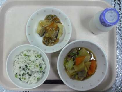 今日のメニューは、菜飯、揚げだし豆腐キノコあん、大根と豚肉のうま煮、牛乳でした。