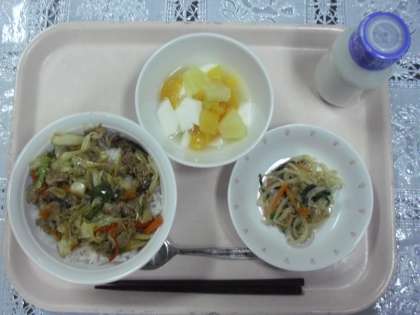 今日のメニューは、ホイコーロー丼、もやしのゴマ風味、杏仁豆腐、牛乳でした。