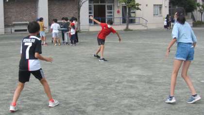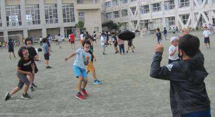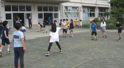 クラスごとにフリスビーが配布され、休み時間などに夢中になって取り組んでいます。子どもたちはルールを工夫して楽しんでいます。