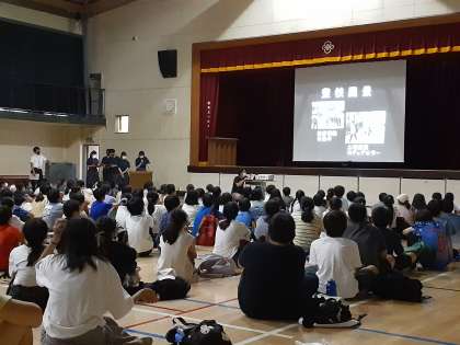 数学や美術などの授業を見たあと体育館て生徒会による学校紹介がありました。