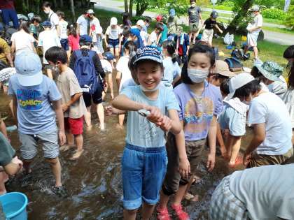 雷雨の可能性があるので、ニジマスのつかみ取りを先に行いました。始めは、なかなか捕まえられなかった子どもたちも徐々にうまくなりました。北見先生も夕飯をゲットしました。ニジマスは、その場で塩焼きになりました。