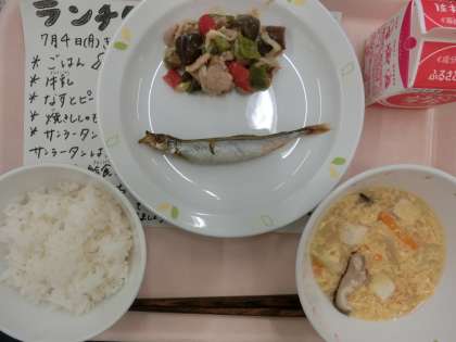 今日の給食は、ごはん、牛乳、なすとピーマンのみそ炒め、焼きししゃも、サンラータンです。