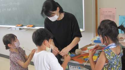 『みんなでワイワイ!紙けん玉』遊んで楽しい紙けん玉を作りました。子どもたちは飾り方を工夫し、友達と協力して作成していました。