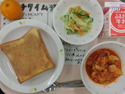 今日の給食は、セサミトースト、牛乳、鶏肉とトマト煮、キャベツサラダ、冷凍みかんです。
