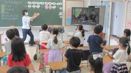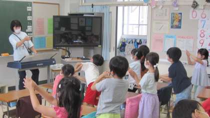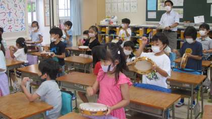 「はくにのってリズムをとろう」の学習をしています。リトミックでは、リズムに合わせて子どもたちは楽しそうに体を動かしていました。『ぶんぶんぶん』のリズム打ちを確認して、タンブリンで叩きました。子どもたちのあふれる笑顔が印象的でした。