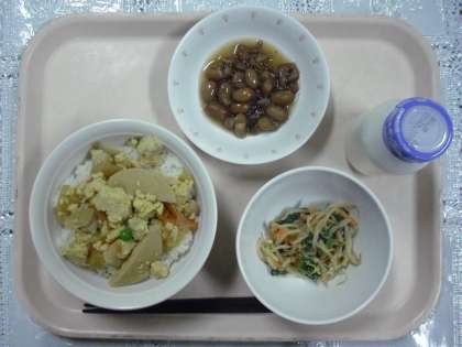 今日のメニューは、親子丼、野菜のごまだれかけ、煮豆、牛乳でした。