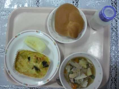 今日のメニューは、ミルクパン、カボチャグラタン、白いんげんの豆スープ、リンゴ、牛乳でした。