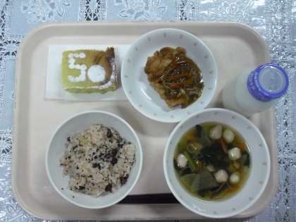明日の開校50周年記念式典をお祝いして、お赤飯、鶏のから揚げ野菜あん、紅白はんぺんのすまし汁、りんごのスイートポテトケーキ、牛乳でした。ケーキには、50周年のロゴマークを描いて、各学級に配膳されました。