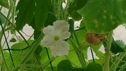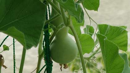 教室内の温度を下げる役目をしているヒョウタンのカーテン。実がなり始めました。(8月3日)