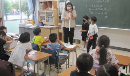 夏休みに時間をかけて作成した自由工作や自由研究の発表をしました。子どもたちは、友達の作品に興味津々です。