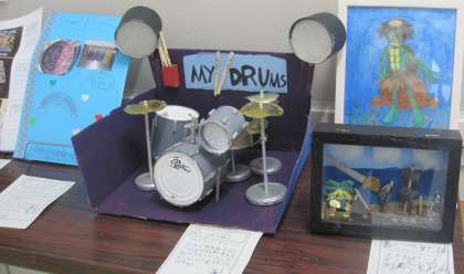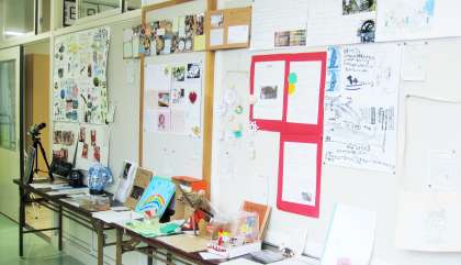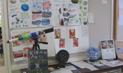 子どもたちの作品は、各クラスの廊下に展示しています。写真は3年生の作品です。