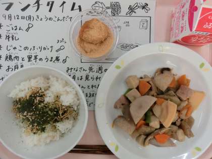 今日の給食は、ごはん、牛乳、じゃこのふりかけ、鶏肉と里芋のうま煮、お月見団子です。