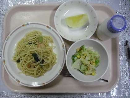 今日のメニューは、小松菜とベーコンのスパゲティ、アーモンドサラダ、リンゴ、牛乳でした。