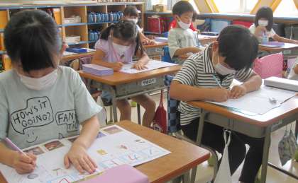 「かたかなをみつけよう」の学習をしています。知っている言葉から、かたかなで表記する言葉を意欲的に発表していました。「レ」「ヘ」の文字をノートに丁寧に書きました。