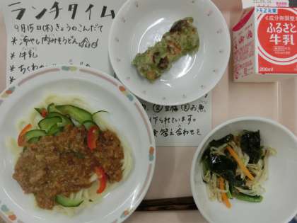 冷やし肉みそうどん、牛乳、ちくわのいそべ揚げ、ナムルです。