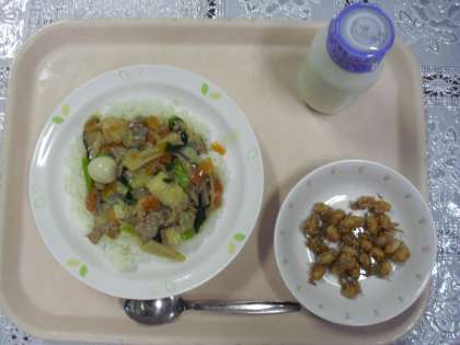 今日のメニューは、中華丼、大豆とじゃこの甘辛揚げ、牛乳でした。