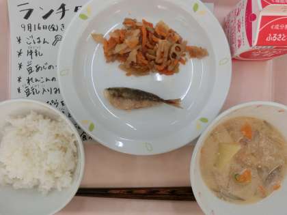 今日の給食は、ごはん、牛乳、豆あじのからあげ、れんこんのきんぴら、豆乳入りみそ汁です。