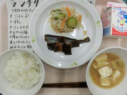 今日の給食は、ごはん、牛乳、さんまの松前煮、もやしの梅じょうゆあえ、厚揚げのみそ汁です。