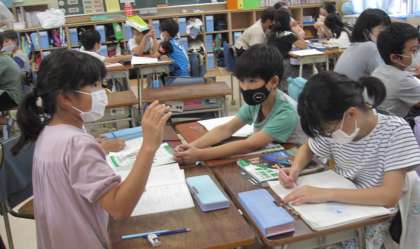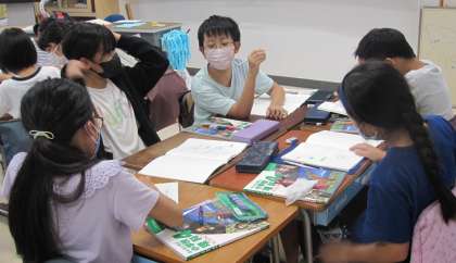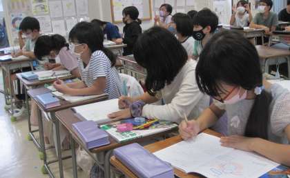 「自然の中の水」について学習しています。課題は『コンクリートなどにしみ込まない水はどこへ行ったのだろうか』です。予想を立て、実験方法を考えました。友達との意見交換を熱心に行っていました。