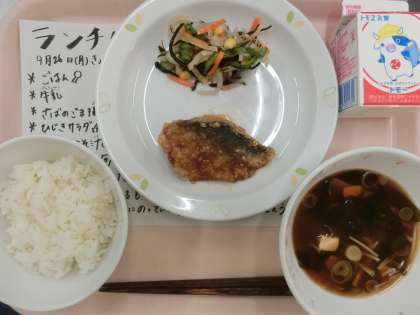 今日の給食は、ごはん、牛乳、さばのごま揚げ、ひじきサラダ、赤だしみそ汁です。