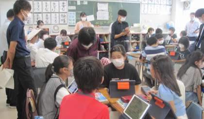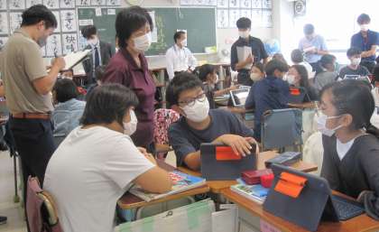 「戦国の世から天下統一へ」について学習しています。本時の課題は『織田信長と豊臣秀吉のどちらが優れた武将か話し合おう』です。調べたことをもとに、それぞれの考えを伝え合いました。世田谷区教育研究会情報部会の先生方も来校し、授業参観をしました。