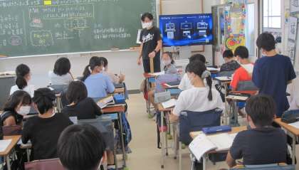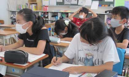 「分数の大きさとたし算、ひき算」について学習を進めています。今日の課題は『分母の違う分数の計算の仕方を考えよう』です。既習事項の通分を活用して考え、授業の終わりには、分かったことを自分の言葉でまとめていました。