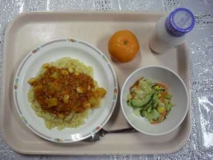 今日のメニューは、チリビーンズライス、ごぼうチップサラダ、ミカン、牛乳でした。