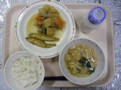 今日のメニューは、麦ごはん、ワカサギのカレー揚げ、肉じゃが、味噌汁、牛乳でした。