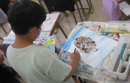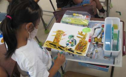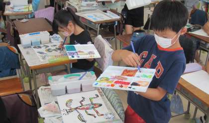 「カラフルな〇〇」を表現します。鳥、植物、虫、乗り物などを黒のクレヨンでかき、絵の具を使って、カラフルに描いていきます。子どもたちは集中して取り組んでいました。