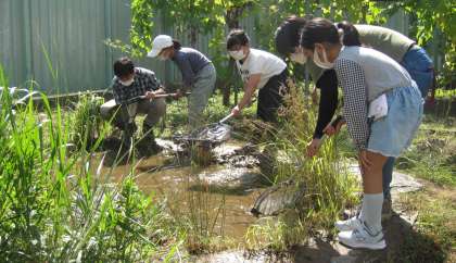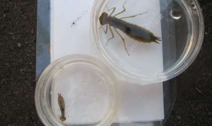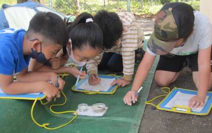 ビオトープで網を使って生き物を捕りました。クロスジギンヤンマ、オオシオカラトンボ、ショウジョウトンボなどのヤゴを捕まえることができました。シャーレに移して体のつくりについて観察しました。