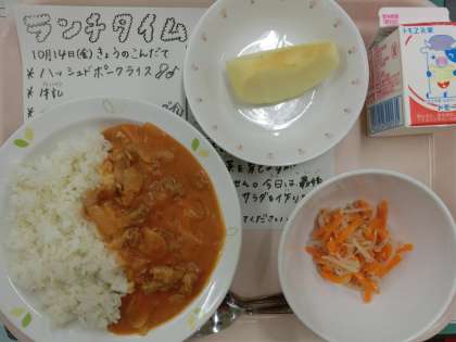 今日の給食は、ハッシュドポークライス、牛乳、マグリーリさんのにんじんサラダ、くだもの(りんご)です。